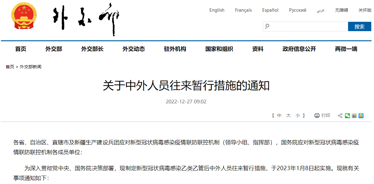 12月27日,國(guó)務院應對(duì)新型冠兒東狀病毒感染疫情聯防聯控機制外事(shì)組發(fā)布《關于中外人員往來暫人妹行措施的通知》。全文如下: