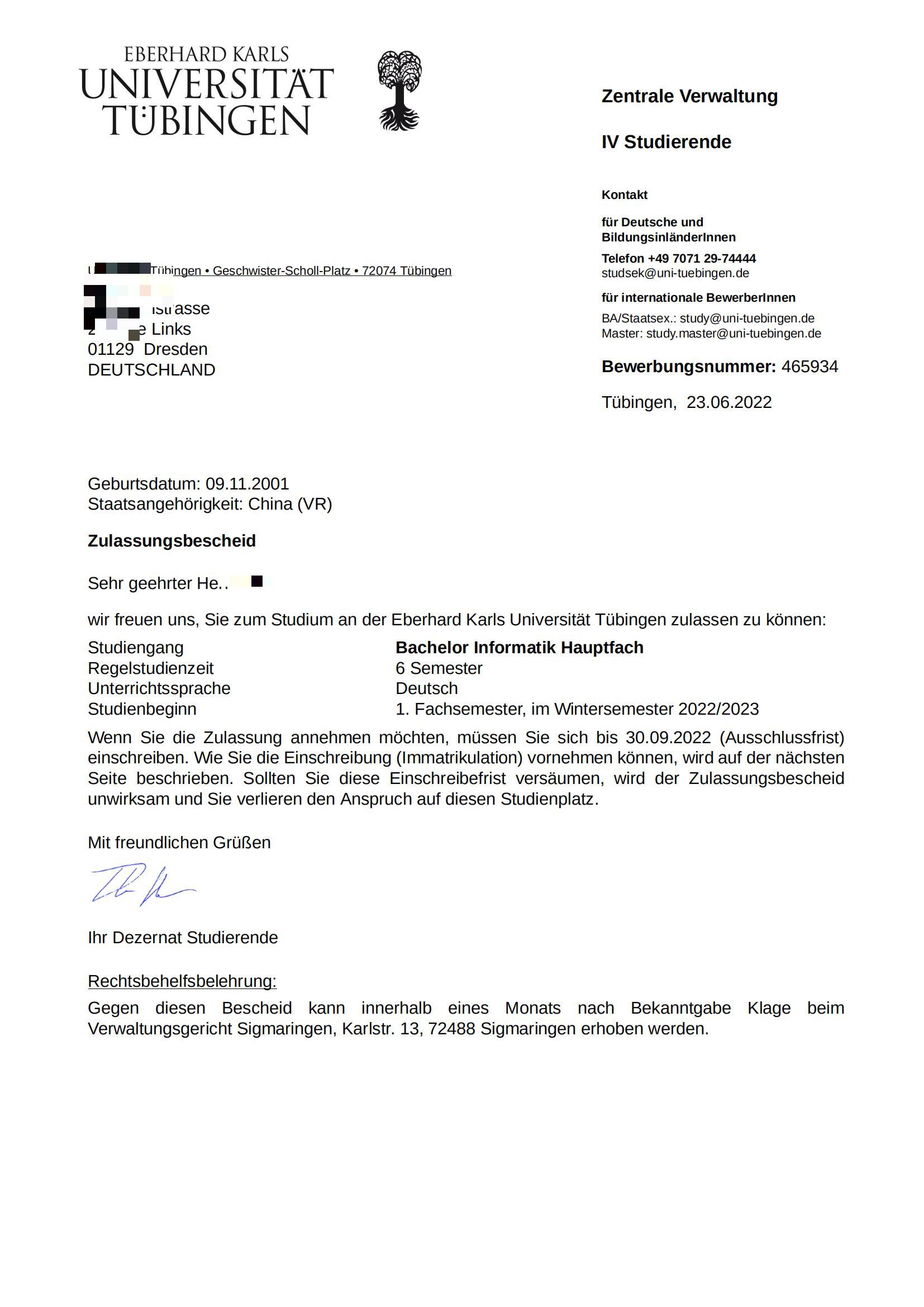 錄取院校:圖賓根大學(xué) 錄取專業:信人費息學(xué)(本科)