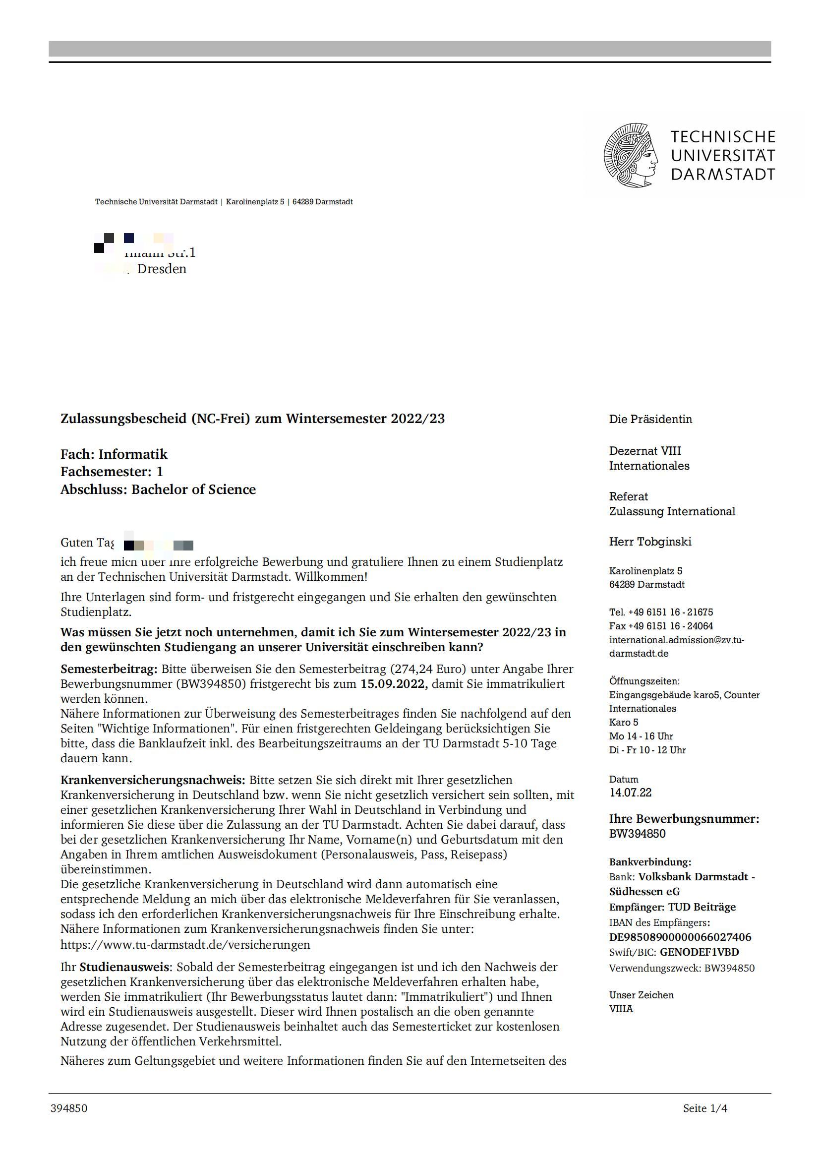 錄取院校:達姆施塔特工業大學(xu場腦é) 錄取專業:信息學(xué)(本科)