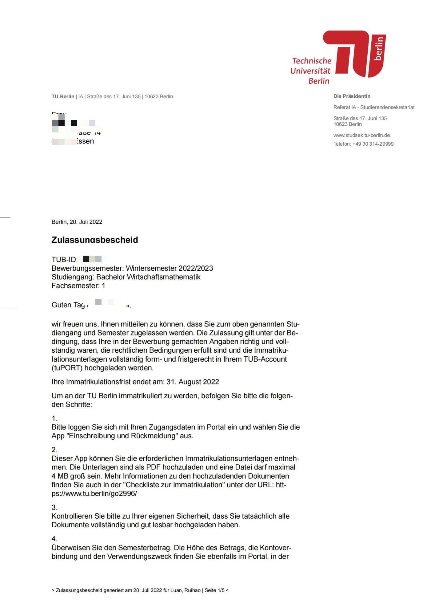 錄取院校:柏林工業大學(xué) 錄取專業:經(jī舞北ng)濟數學(xué)(本科)