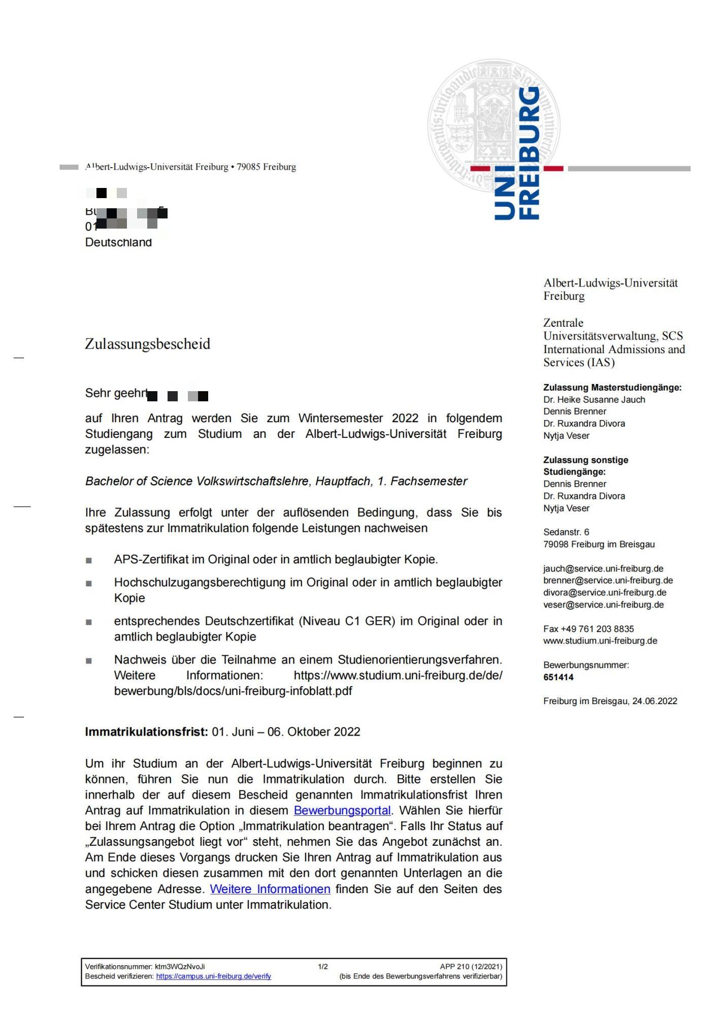 錄取院校:弗萊堡大學(xué) 錄取專業:國(guó)民經為子(jīng)濟學(xué)(本科)